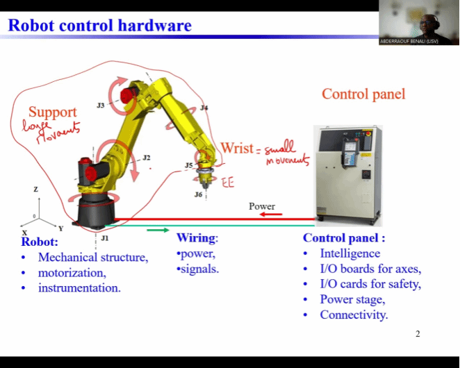 于薇薇教师邀请法国巴黎萨克雷大学Abderraouf Benali讲授了《康复机器人系统》这门课程。课程内容包括康复机制、康复运动、康复机器人系统的分类、机器人运动学建模以及动力学建模、机器人控制策略、上肢康复应用及其案例研究。通过学习,同学们掌握了机器人学的主要内容,了解了康复机器人特别是应用于肢体康复的康复机器人的康复机理;还学习了如何构建平面二自由度的机器人的正逆运动学模型,以及人体上肢关节种类和运动方式以及几种现有的康复机器人的结构设计,了解了机器人的阻抗控制技术。