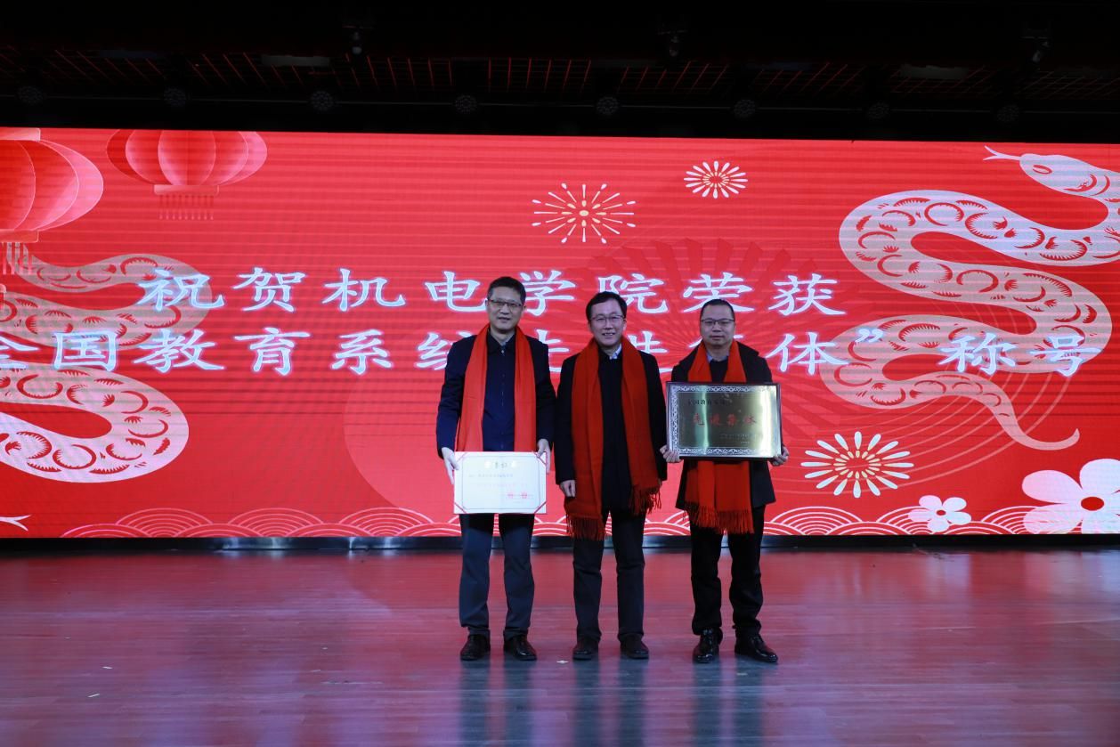 张卫红院士为williamhill中国官方网站颁发“全国教育系统先进集体”奖状,这一荣誉是对williamhill中国官方网站过去在各项工作所取得成绩的高度认可,张映锋、常洪龙代表全体教职工上台领奖。