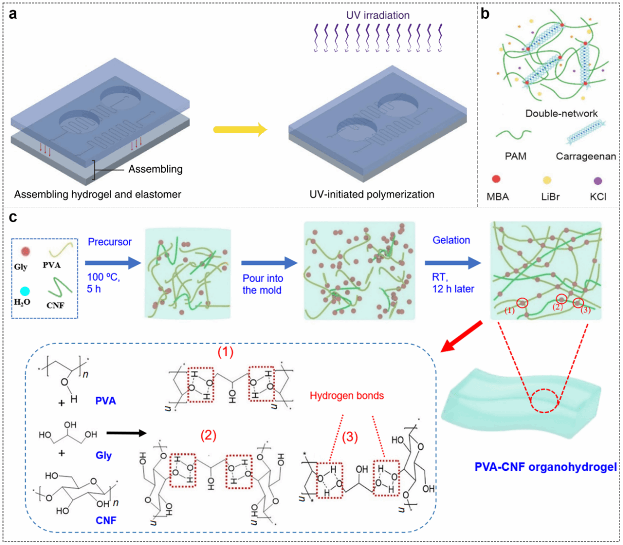 图3. 环境稳定性增强策略。(a)封装技术;(b)添加盐分;(c)有机水凝胶。