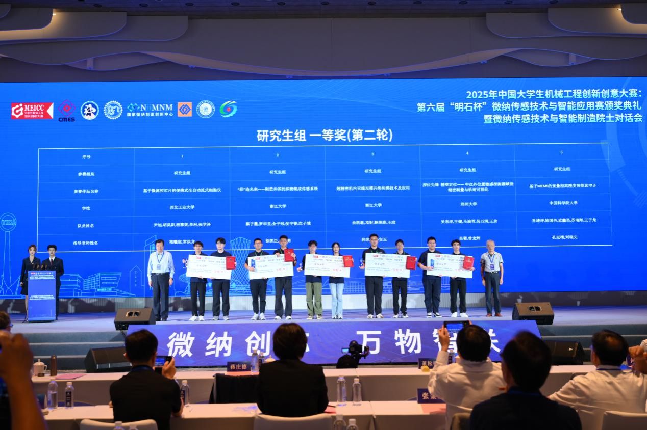 全国总决赛共有236支本、专科生组参赛队,133支研究生组参赛队,369支行业精英战队,进行了微纳技术与智能应用的“巅峰对决”,最终评选出三等奖73个,二等奖113个,一等奖30个。由常洪龙教授、苑曦宸副教授指导,2023级博士生尹旭代表完成的“基于微流控芯片的便携式全自动流式细胞仪”项目,荣获大赛研究生组一等奖。
