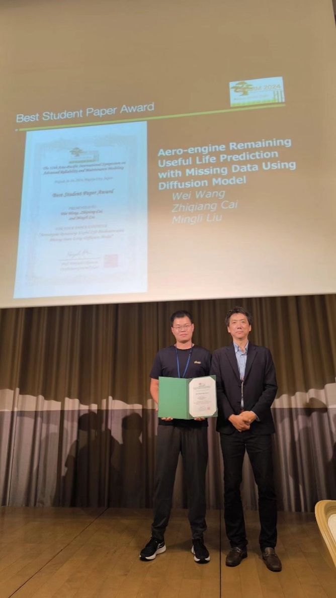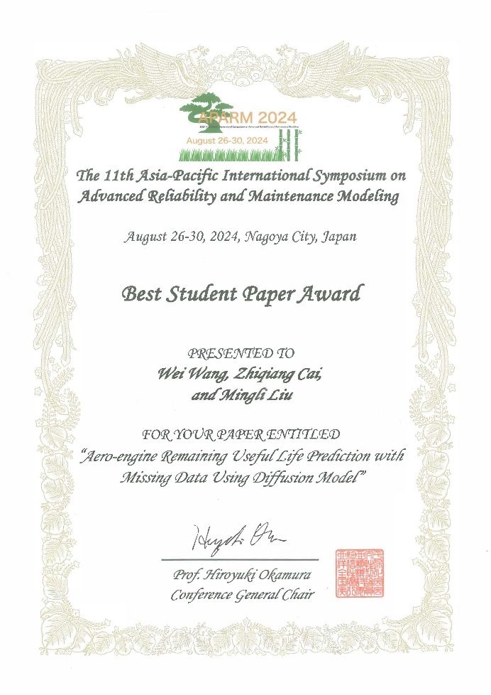 在此次会议上,williamhill中国官方网站蔡志强教授课题组荣获了APARM 2024最佳学生论文奖。获奖论文题为《Aero-engine Remaining Useful Life Prediction with Missing Data Using Diffusion Model》。该论文聚焦于航空发动机状态监测数据缺失对深度学习模型预测精度的影响,提出了一种名为DiffFMD的创新数据填充方法。通过有效填补数据缺失,这一方法显著提升了剩余使用寿命预测的准确性,展现了该课题组在复杂系统可靠性研究方面的重要进展。