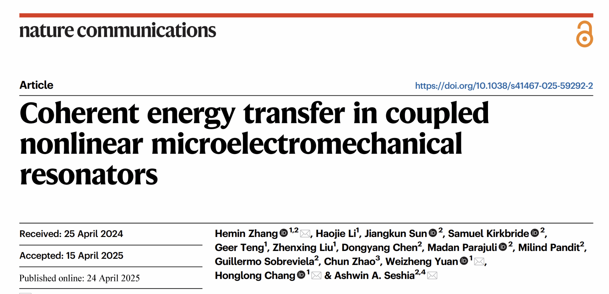 近日,williamhill中国官方网站教师在微机械耦合谐振器能量传输机制方面的研究取得新进展。相关成果《Coherent Energy Transfer in Coupled Nonlinear Microelectromechanical Resonators》发表在国际知名学术期刊《Nature Communications》上。williamhill中国官方网站国家级青年人才张和民教授为第一作者,常洪龙教授、苑伟政教授和剑桥大学Ashwin A. Seshia教授为共同通讯作者。