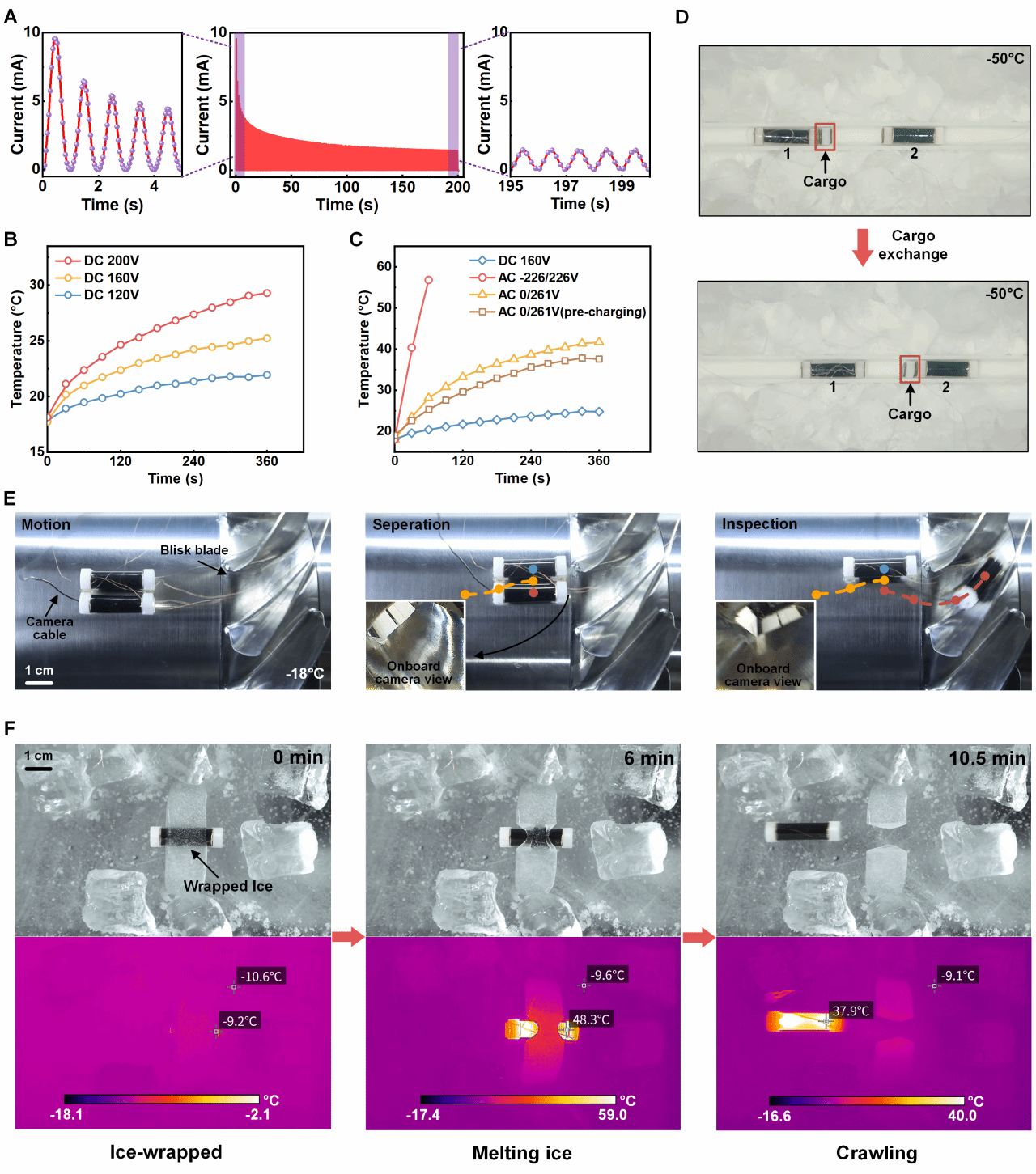 机器人可控发热和冰冻环境运动。(A-C) 机器人的可控发热性能;(D-F)机器人在寒冷冰冻中执行不同的任务